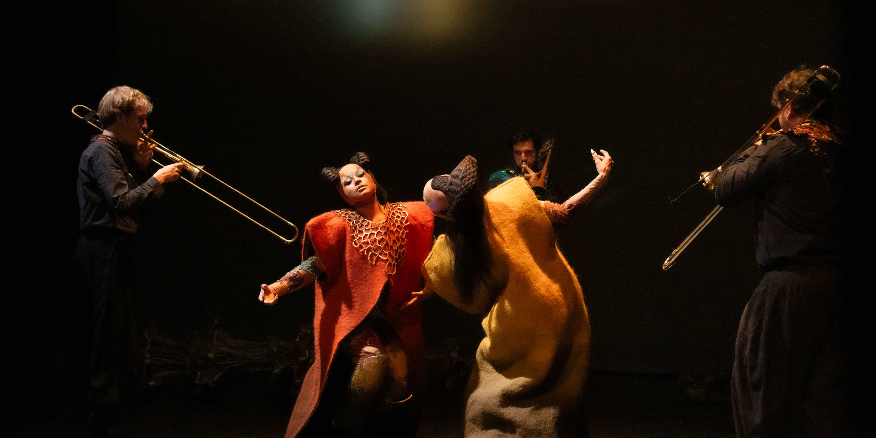 conception, direction musicale, scénographie, mise en scène Nina Laisné avec François Chaignaud, Nadia Larcher sacqueboute ténor, serpent, flûte Rémi Lécorché sacqueboute ténor Nicolas Vazquez sacqueboute ténor, wacrapuco Joan Marín bandonéon Jean-Baptiste Henry théorbe, sachaguittara Daniel Zapico percussions traditionnelles Vanesa Garcia chorégraphie, collaboration artistique François Chaignaud conseil musical, collaboration artistique Nadia Larcher chorégraphe associé Néstor ‘Pola’ Pastorive création et régie lumière Abigail Fowler régie générale Sara Ruiz Marmolejo régie son Alice Lemoigne, Guilhem Angot régie costumes Sarah Duvert assistanat scénographie Julie Reilles ingénierie structure Arteoh - Benoît Brobst et Augustin Brobst construction scénographie Théâtre de Liège (directeur technique : Emmanuel Deck ; chef d’ateliers : Cédric Debatty ; menuisiers : David Halleux, Ferdinand Durmisovski, Aurélien Defize, Ioannis Katikakis, Philippe Gustin ; serrurier : Gary Gouders ; décoratrice : Sandra Belloi ; stagiaire : Felix Pêcheur), Les 2 Scènes, Scène nationale de Besançon (directeur technique : Emmanuel Cèbe ; constructeur : David Chazelet) - constructeur : Gaby Sittler - accessoiriste : France Chevassut, Nina Laisné - peintres : France Chevassut, Sylvie Mitault, Alan Da Silva, Nina Laisné conception et confection des costumes Sarah Duvert, Florence Bruchon confection des costumes Théâtre de Liège (coupeuses : Christine Picqueray et Anicia Echevarria, couturières : Agnès Brouhon et Christelle Vanbergen, chargé à la coordination : Pierre Matteucci, stagiaires : Nathan Ludwig et Zoé Jacobs), Opéra de Limoges (cheffe costumière : Nelli Vermel, assistante costumière : Raymonde Maranay, stagiaire : Pauline Saintonge) - teinturière : Amandine Brun- Sauvant - ébéniste : Mathieu Paesmans - faux crâne : Rebecca Flores Martinez, Sarah Duvert - perruquières : Coline Bourdere et Caroline Porte création maquillage Lou Thonet stagiaires Orane Bernard, Pauline Couturon, Plume Ducret, Léa Warind’Houdetot transmission des danses Rodrigo Jesus Colomba, Maximiliano Colussi, Gustavo Gomez, Carlos González, Ivana Herrera, Pablo Lugones, Petete, Nelson Vega et Yanina Olmos, Jorge Vázquez, Alexis Mirenda administration, production Zorongo : Martine Girol, Valentina Salazar Henao / Mandorle productions : Chloé Perol, Jeanne Lefèvre, Emma Forster production, diffusion Bureau Platô : Séverine Péan.