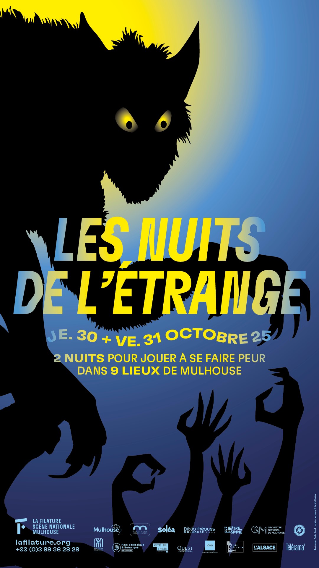 Les Nuits de l’Étrange sont portées par La Filature, Scène nationale de Mulhouse, en partenariat avec le réseau des bibliothèques de la Ville de Mulhouse – la Médiathèque de La Filature, la Bibliothèque Salvator et la Bibliothèque Grand’Rue –, l'Orchestre National de Mulhouse, E-nov Campus et KMØ, le Musée historique, le Musée National de l’Automobile, la Cité du Train – Patrimoine SNCF, le Cimetière de Mulhouse et l’association Mémoire mulhousienne, le Théâtre de la Sinne, le Parc zoologique et botanique en partenariat avec Pierre Fraenkel, Les Impropulseurs et QUEST, Créateurs d’Aventures.